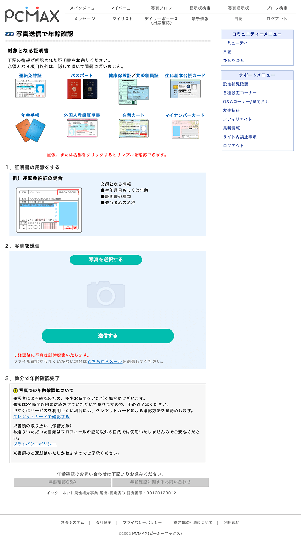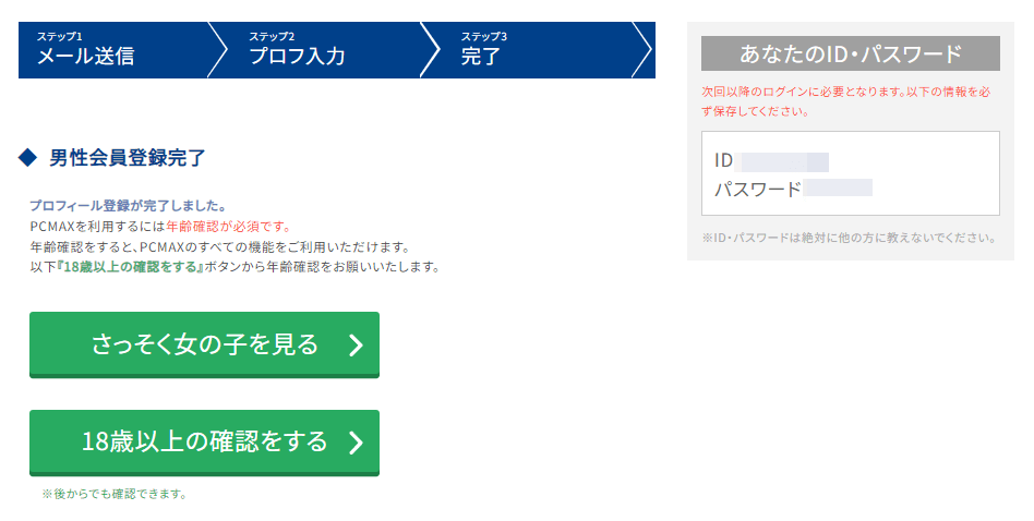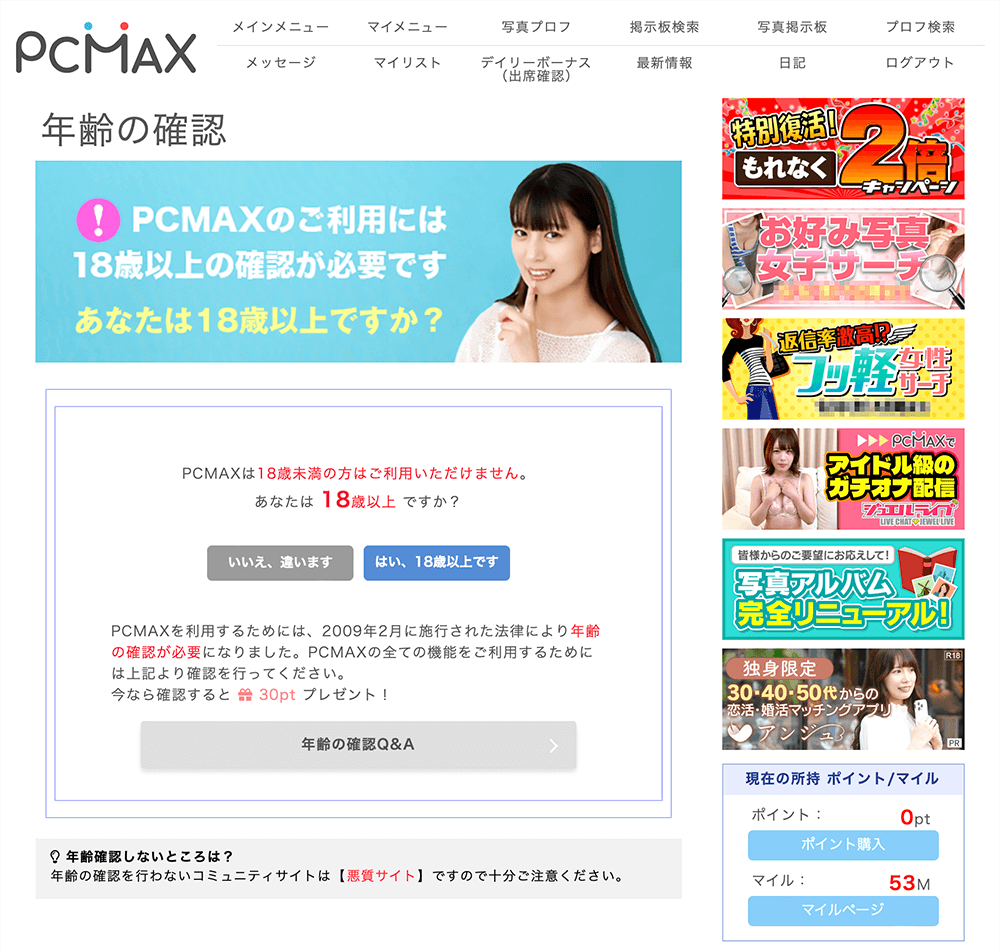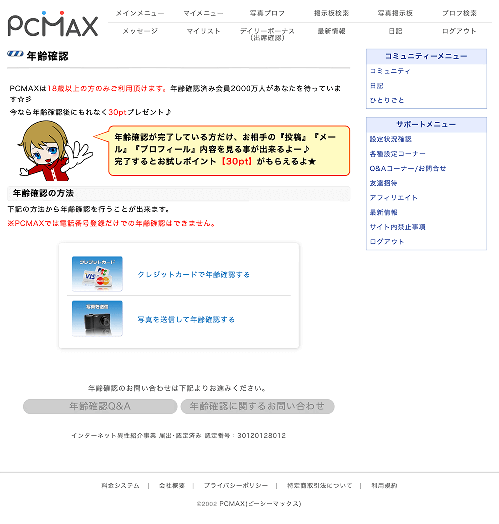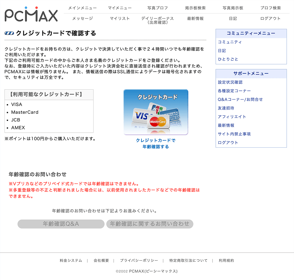 PCMAXのWEB版にログインした場合、クレジットカードでの年齢確認が可能となります。