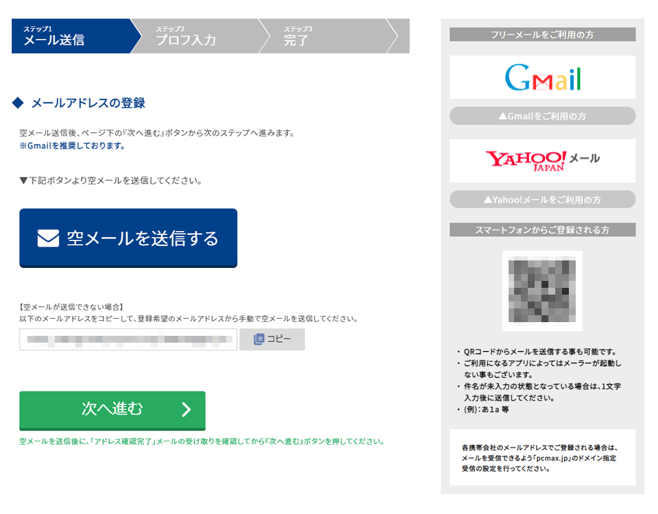 ・空メールを送信するをクリックして、メールフォームが開いたら、自分の登録したいメールアドレスであることを確認して、何も入力せず、そのまま送信します。